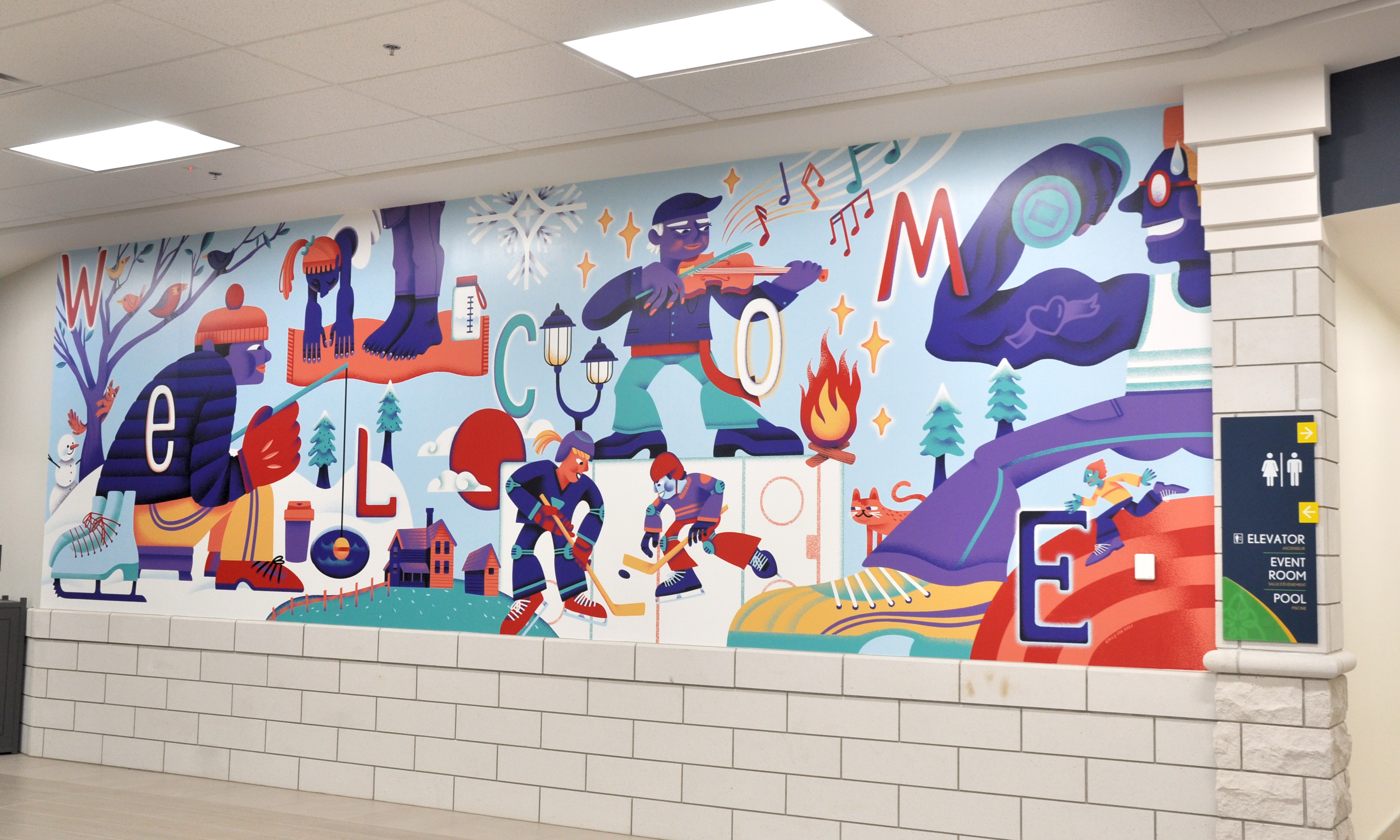 3 interior vinyl murals for Beaumont’s first public art project. Celebrating curiosity, play, and all-season recreation.