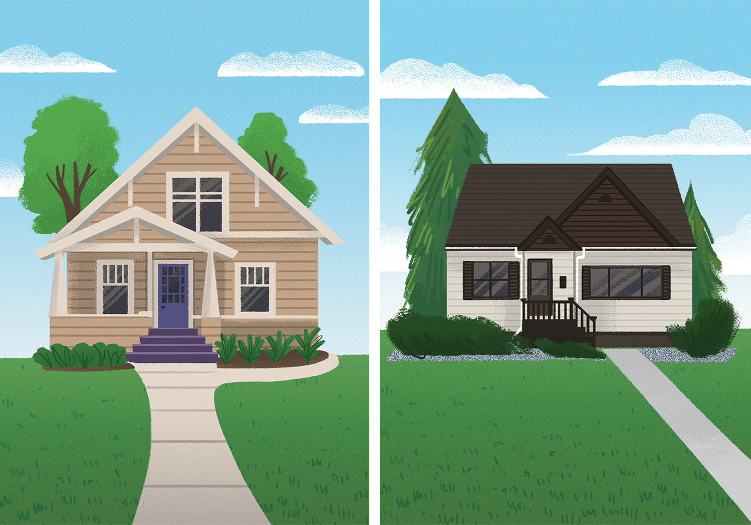 Trading card illustrations depicting different eras of homes in Edmonton.